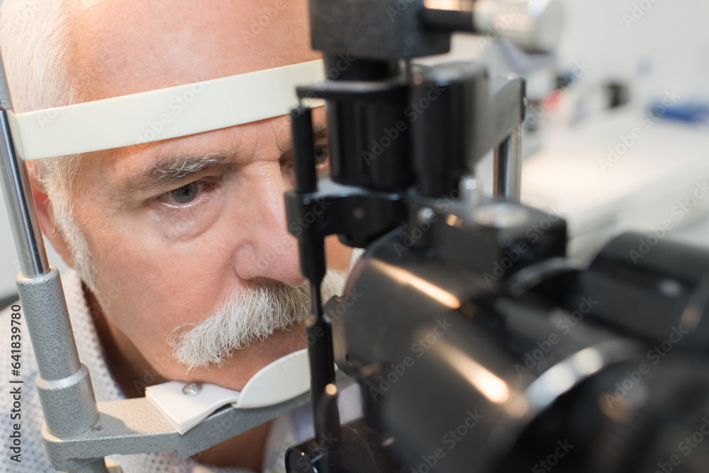 close-up of senior man having eyesight test in clinic