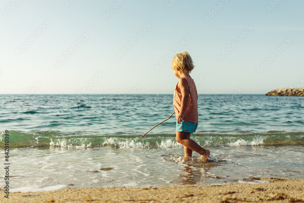 a little blond boy walks along the seashore with a stick in his hand plays laughs runs