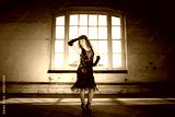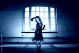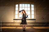 1920's Flapper girl with red hair dancing in a slightly see through black Bugle Bead Charleston dress