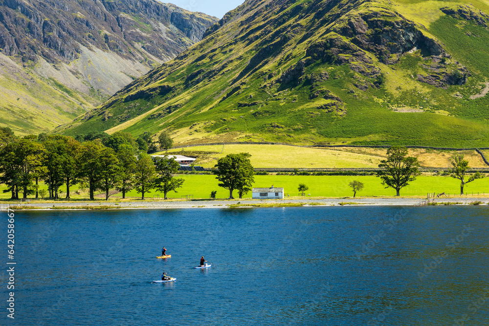 Kayaks and paddleboards on a calm, peaceful lake surrounded by tall mountains (Buttermere, Lake Distrtict)