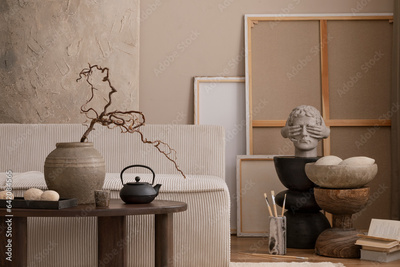 Creative composition of cozy living room interior with mock up poster frame, modular sofa, wooden coffee table, vase with branch, beige carpet, wooden sideboard, black stand, pillow. Template.