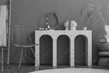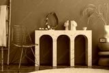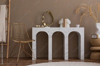 Creative composition of warm living room interior with marble console, gold chair, round rug, vase with dried flowers, books, plaid, gold sculpture and personal accessories. Home decor. Template.