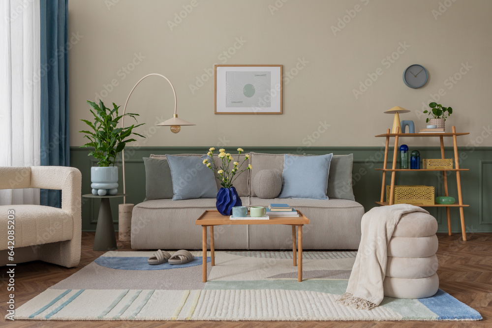 Creative composition of cozy living room interior with mock up poster frame, modular sofa, blue pillows, wooden coffee table, patterned rug, beige wall and personal accessories. Home decor. Template.