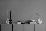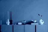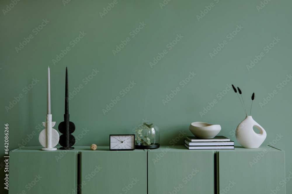 Modern living room interior composition with modern home decorations and personal accessories on the eucalyptus wooden commode. Sage green wall. Template. Copy space.