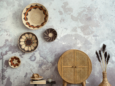 Minimalist composition of ethnic living room interior with colorful baskets, rattan sideboard, black stool, book, gray concrete wall and elegant personal accessories. Home decor. Template.