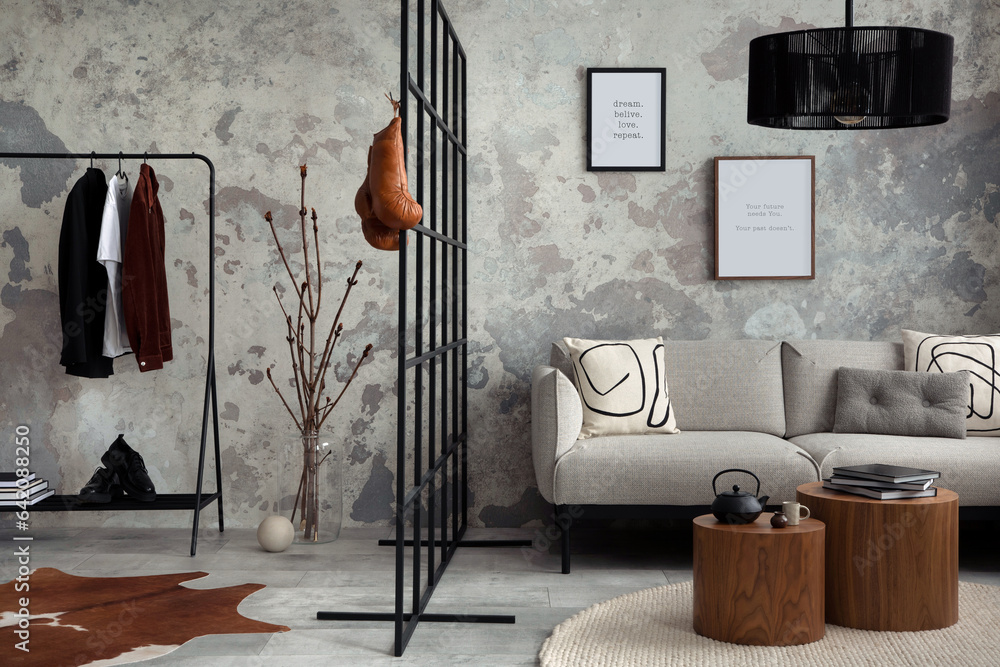 Sophisticated composition of modern living room with design sofa, lamp, carpet, clothes rack , decoration and personal accessories. Wabi sabi concrete wall. Minimalist home decor. Template.