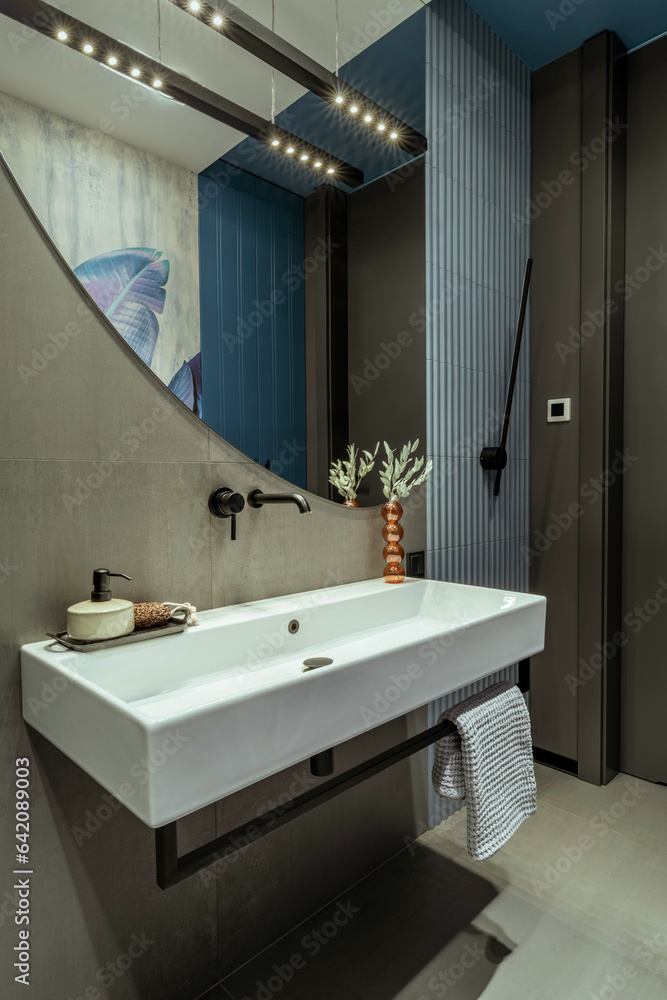 Interior design of bathroom interior with big mirror, white silk, towel, gray tiles, modern lamp, vase with dried flowers and personal accessories. Home decor. Template.