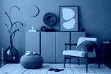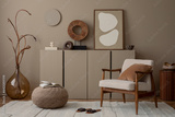 Creative composition of living room interior with mock up poster frame, boucle armchair, pillow, vase with branch, wooden sculpture, slippers, beige rug and personal accessories. Home decor. Template.
