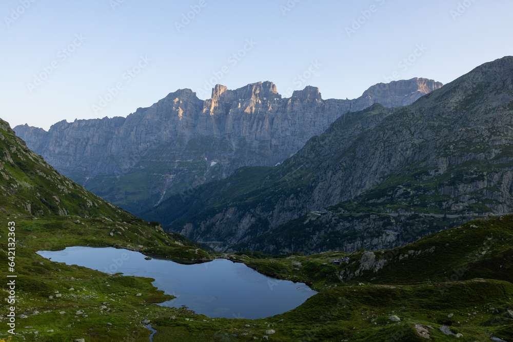 Fantastic azure alpine lake Champfer. Unusual and picturesque scene. Location famous resort Silvaplana village, district of Maloja in the Swiss canton of Graubunden, Alps. Europe. Beauty world.
