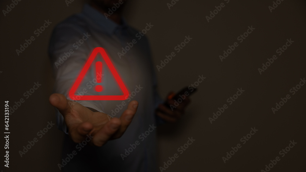 Hacking Concept. Attention warning attacker alert sign with exclamation mark on dark red background.Security protection Concept. vector illustration.