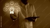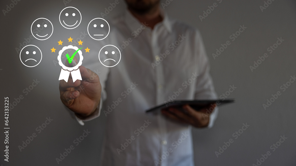 Businessman holding and showing the best quality assurance with golden five stars for guarantee product and ISO service concept.