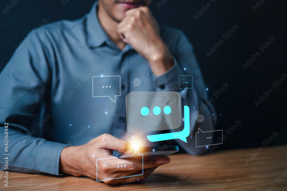 social network, conversation, message, comment, speech bubble, banner, context, communicate, discussion, chat. use smartphone to check social media, around that message and comment HUD show it.