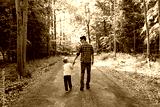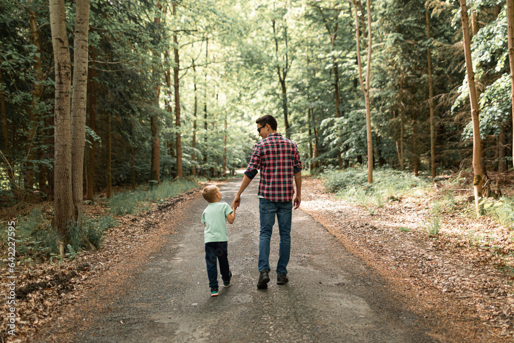 Father and Son Walking in a Forrest Nature Setting Bonding in Nature. Family Parent and Child Relationship concept.
