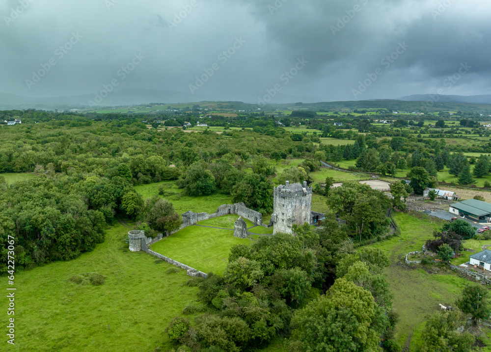 Aerial view of Aughnanure castle in Ireland with large multi-storeytower house keep, Gothic palace great hall and water filled moat