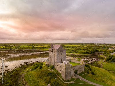 Aerial view of Dunguaire Castle is a 16th-century tower house on the southeastern shore of Galway Bay in County Galway, Ireland, near Kinvara with dramatic sunset sky