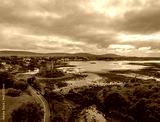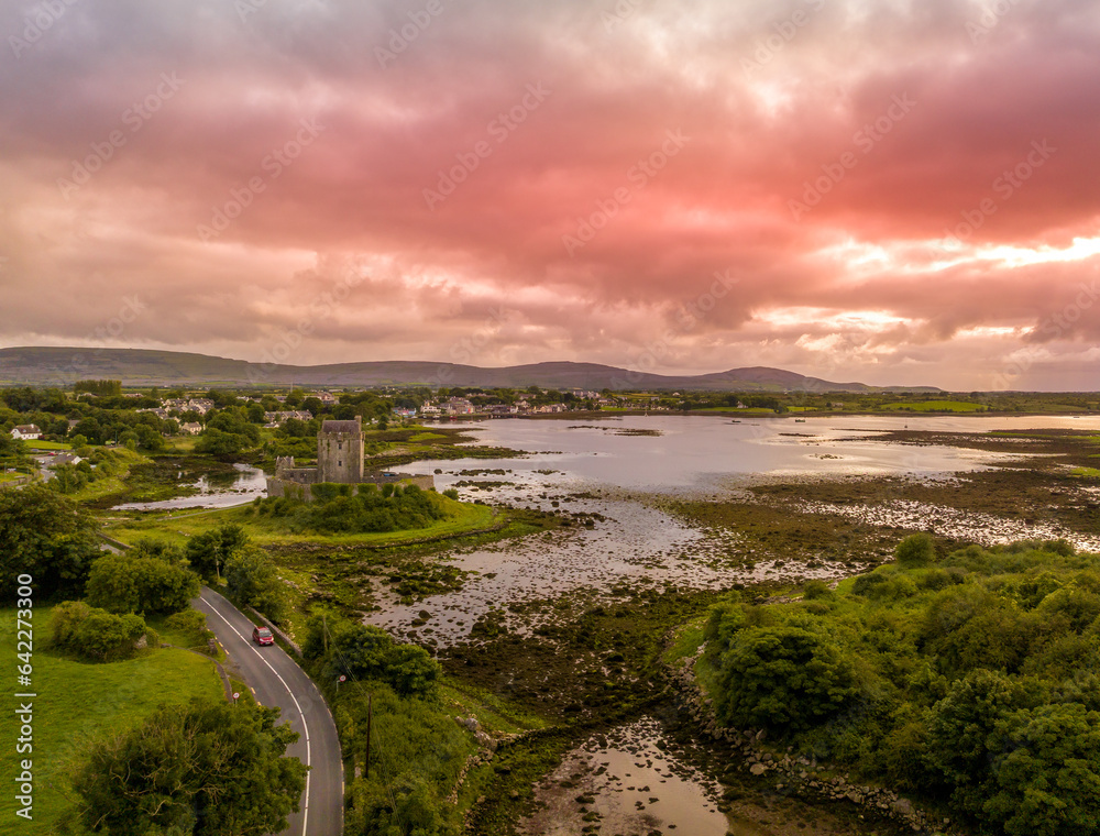 Aerial view of Dunguaire Castle is a 16th-century tower house on the southeastern shore of Galway Bay in County Galway, Ireland, near Kinvara with dramatic sunset sky