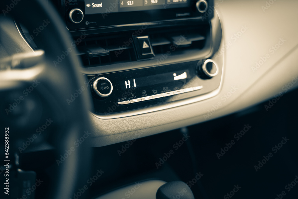 Toned photo highest temperate heat setting with knobs, digital display inside modern leather car interior, defrost mode fan at full blast defogger windshield windows