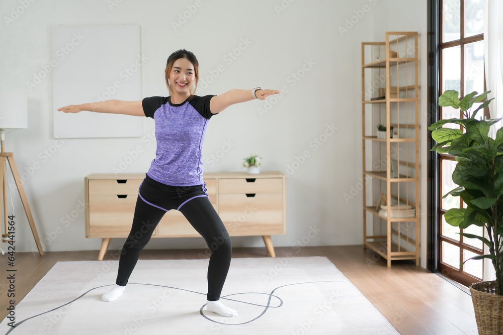 Young asian woman doing yoga balance exercise with warrior pose for healthy lifestyle at home