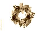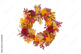autumn wreath of artificial red leaves and autumn fruits. Isolate on white.