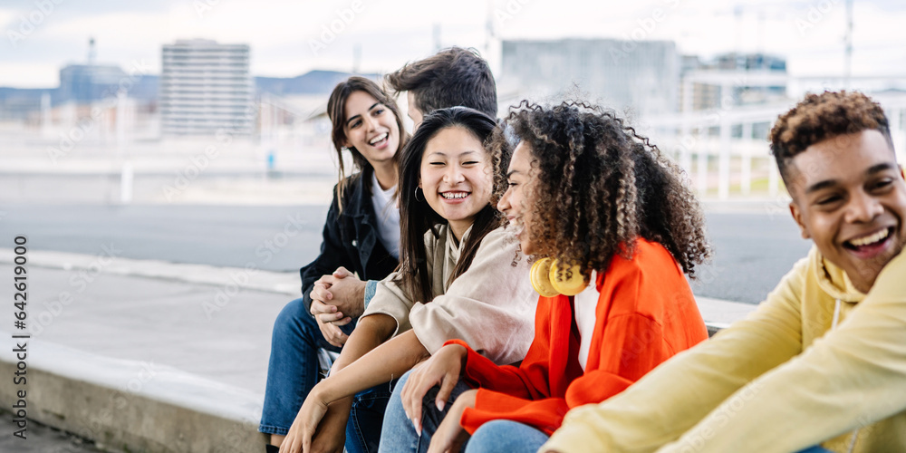 Young group of happy students sitting together outside while hanging out. Millennial people enjoying a conversation. Copy space for text