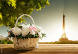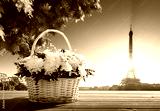 flowers in basket and Eiffel tower, Paris