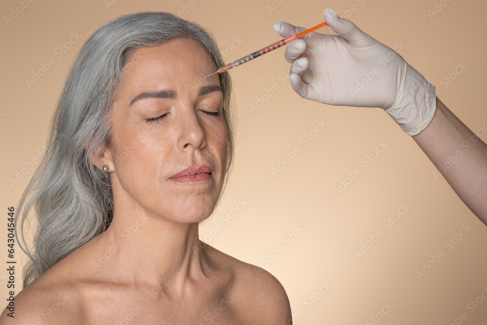 Skin lifting concept. Headshot of senior woman receiving beauty filler injection in forehead, beige background