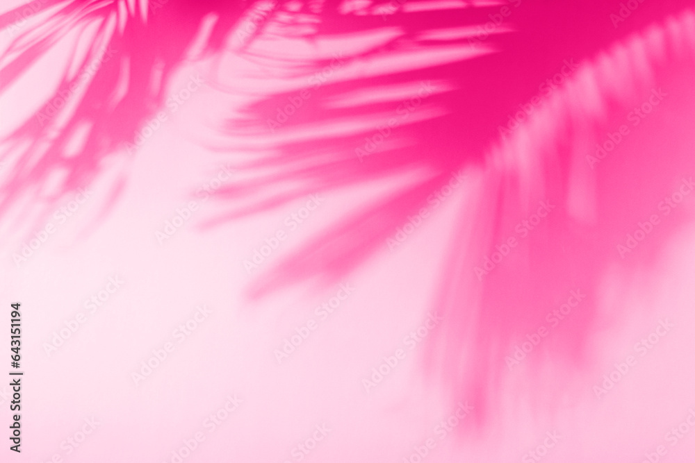 Palm leaf shadow on a pink tones wall. Minimal summer exotic concept with copy space