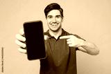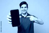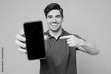 Young happy man wears green t-shirt casual clothes hold in hand use point finger on close up mobile cell phone with blank screen workspace area isolated on plain yellow background. Lifestyle concept.