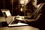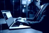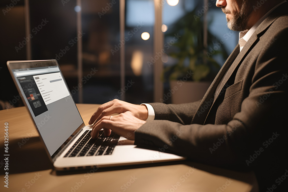 Man in business suit using laptop at home, remote work, telecommuting, online meetings, virtual collaboration, home-based work, work from home