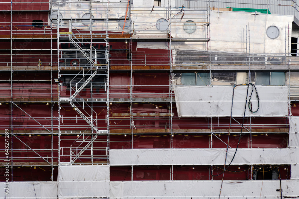 New ferry in construction using crane and scaffolding at Port Glasgow