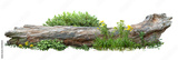 Dead tree fallen and lying on the ground. Cutout tree trunk surrounded by flowers. Garden design isolated on transparent background. Flowering shrub and green plants for landscaping. Flowerbed.
