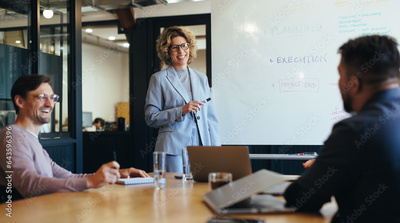 Group of professionals having a discussion in a meeting. Business woman stands in a boardroom doing a presentation