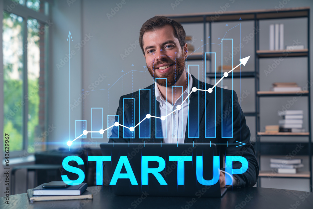 Smiling businessman in formal wear working on laptop at office workplace with smartphone and notebooks. Concept of successful business deal, agreement. Start up rocket icons.