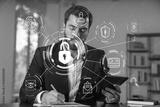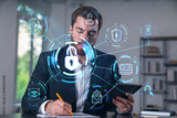 Considered businessman in formal wear signing contract holding tablet device at office room with papers. Concept of successful business deal, agreement, partnership, documents. Lock icons.