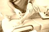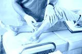 Professional phlebologists carefully examining legs with signs of varicose veins of female patient lying on couch in clinic, cropped shot..