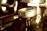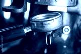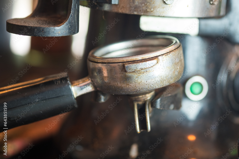 Grinded coffee beans into a metal filter holder in a coffee machine close-up, making espresso coffee