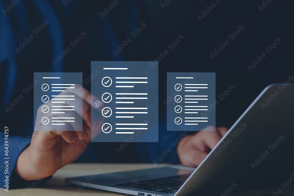 Businessman showing check mark summarizing job Compile lists, votes, and to-do lists. Checklists, task lists, and summaries description checklist Documents and online quality assessment standards