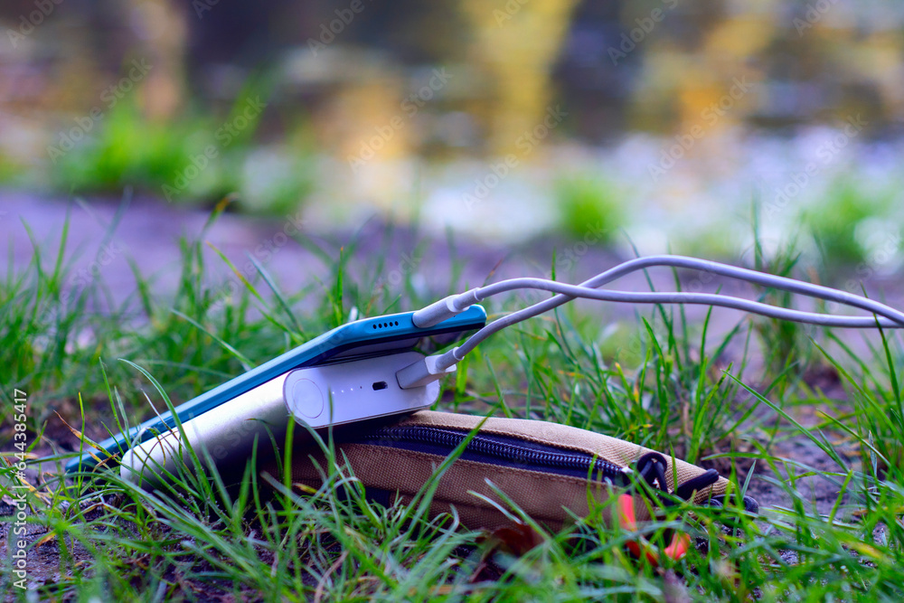 Portable charger charges a smartphone in nature. Power Bank on a journey to charge gadgets.