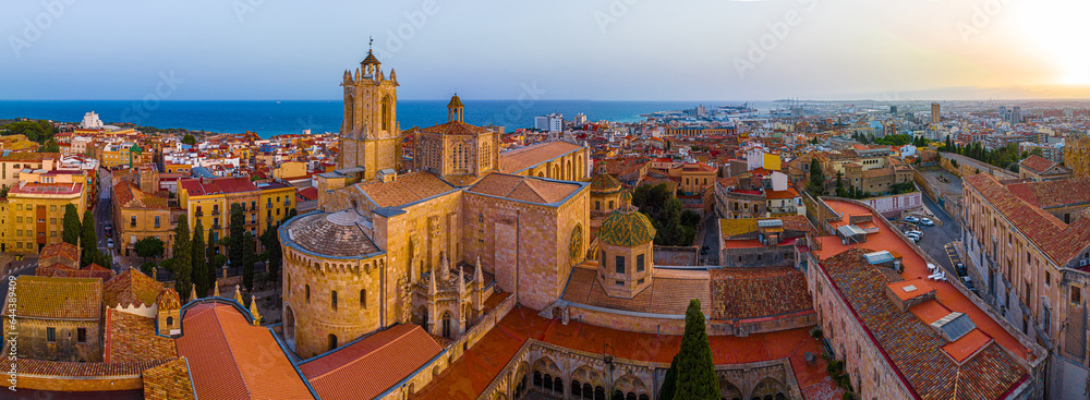 Aerial view of the Primatial Cathedral of Tarragona, a Roman Catholic church in Tarragona, Catalonia, Spain