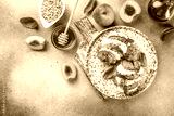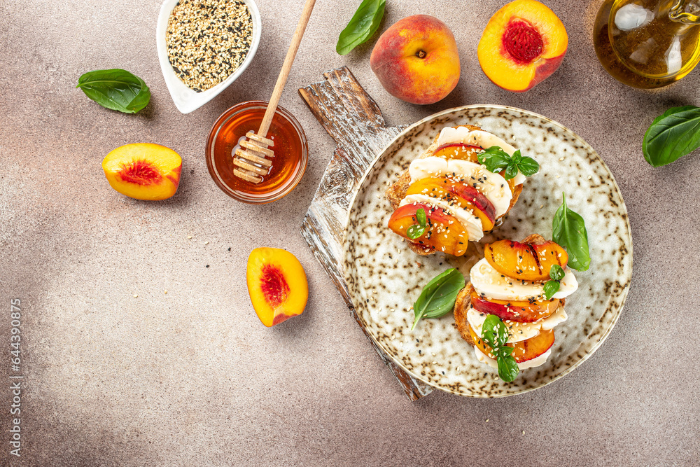 Italian Caprese salad with peaches, mozzarella on toast. Clean eating, dieting, vegan food concept. top view