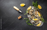 fresh oysters on plate with lemon on a dark background. Seafood. banner, menu, recipe place for text, top view