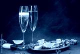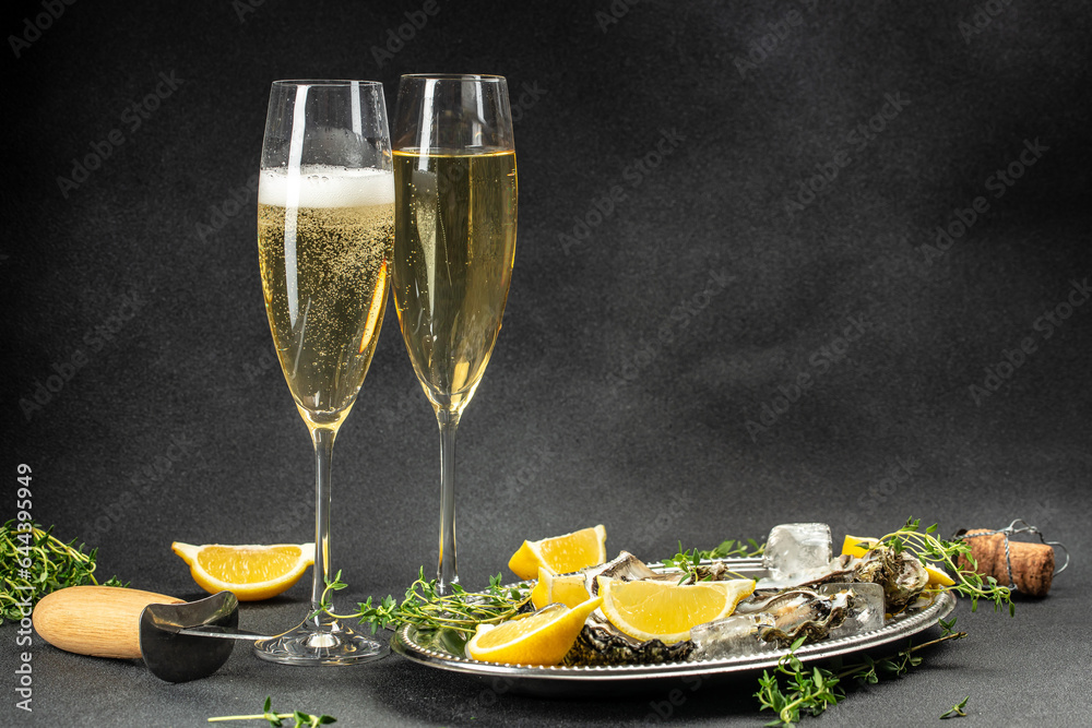 fresh oysters and lemons in bowl near champagne glasses. banner, menu, recipe place for text