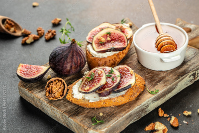 Bruschetta with figs, honey and goat cheese. Concept healthy and balanced eating. place for text, top view