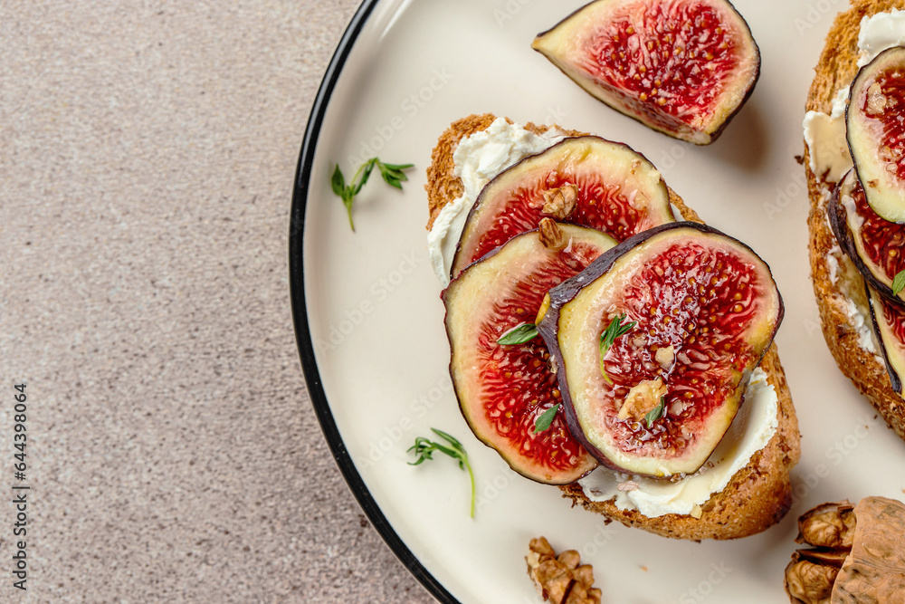 Figs fruit toast with honey and walnut on plate. Food recipe background. Close up
