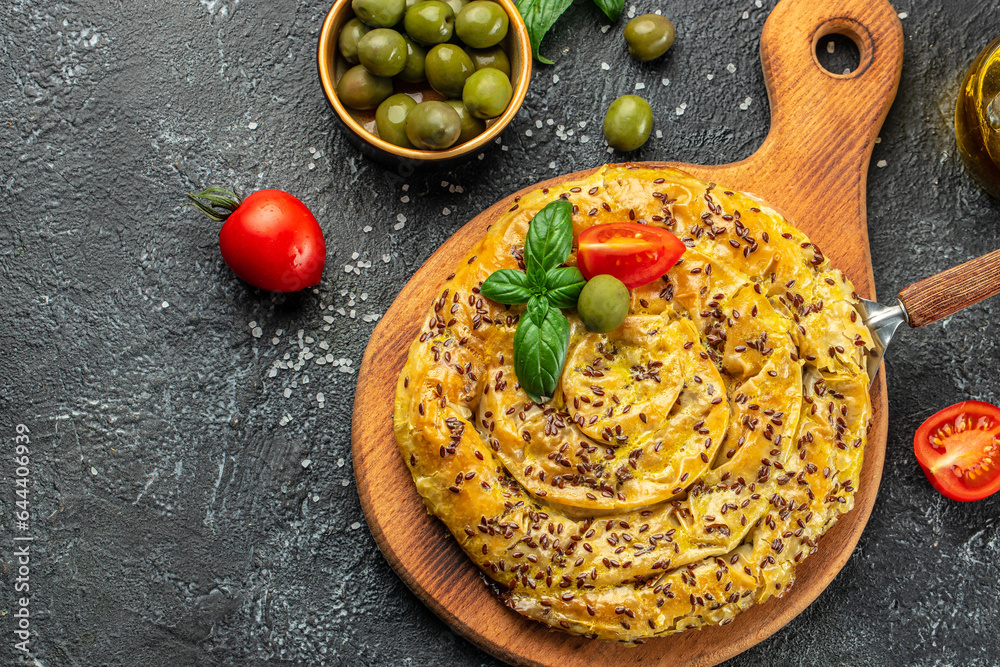 greek spanakopita pie with organic cheese on a wooden board, Restaurant menu, dieting, cookbook recipe top view