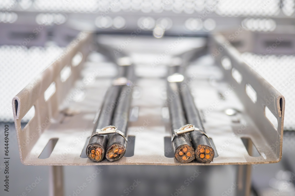 Cable channel in section. Power wires with copper content. Metal cable channel for power wires. Sectional view of four copper wires. Electrification of premises. Electric cable in engineering ways