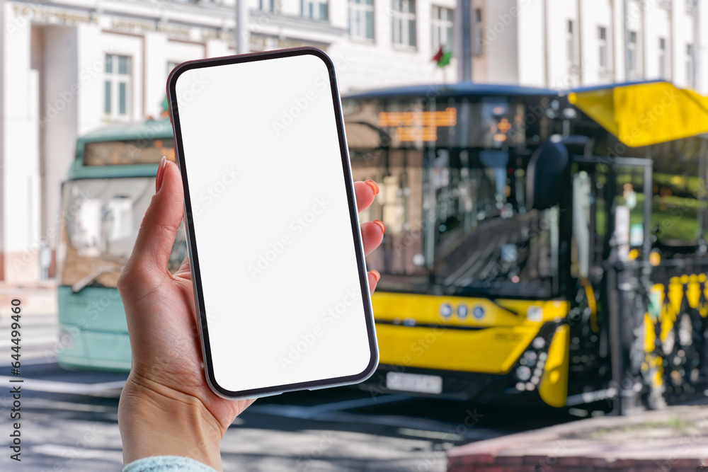 Girl holds a mock-up of a smartphone with a white screen in her hands at a bus stop against the backdrop of a bus.