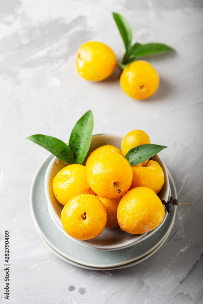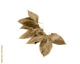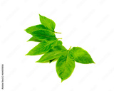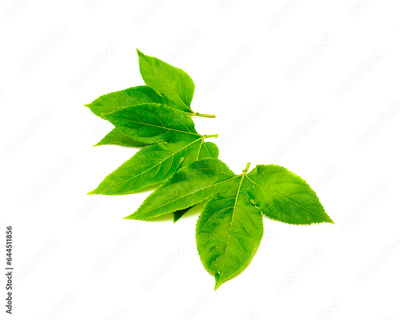 Three passion fruit leaves with 3 lobes, upper surface in dark green, smooth, and glossy growing in alternate pattern and have serrated, toothed edges isolated white background