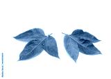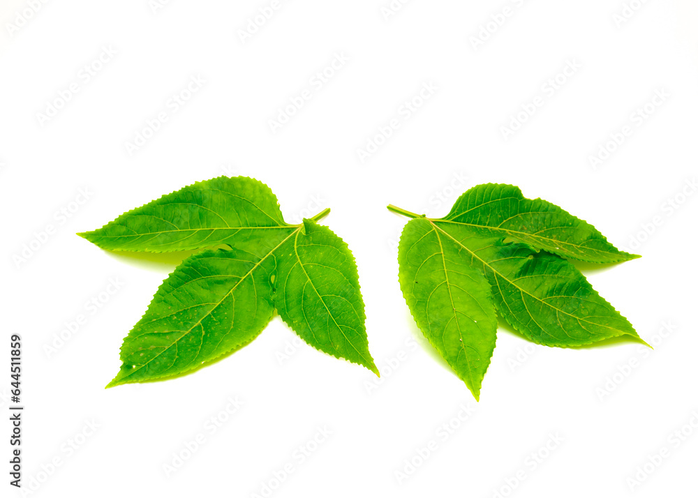 Two passion fruit leaves with 3 lobes, upper surface in dark green, smooth, and glossy growing in alternate pattern and have serrated, toothed edges isolated on white background