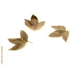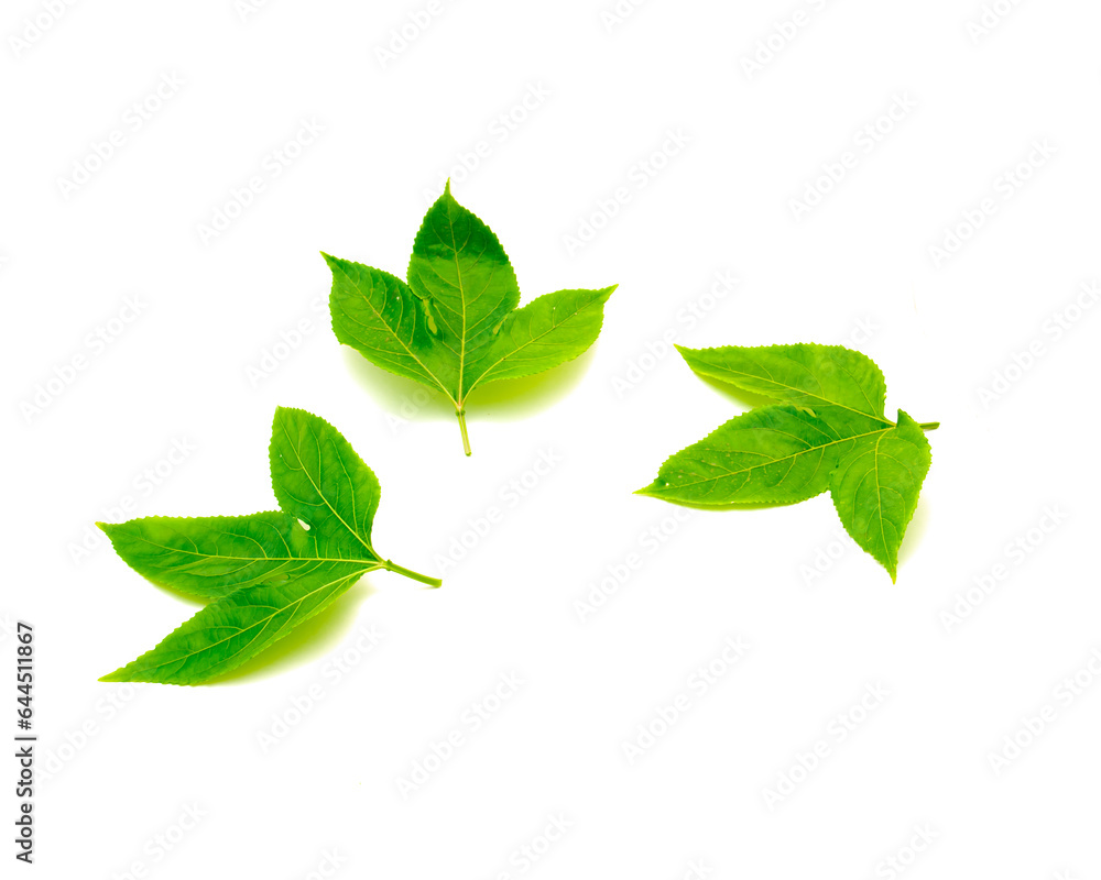 Three passion fruit leaves with 3 lobes, upper surface in dark green, smooth, and glossy growing in alternate pattern and have serrated, toothed edges isolated white background